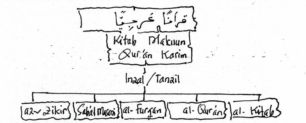 Setidaknya terdapat lima tema dari Qur’ānan ‘Arabiyyan yang diwahyukan Allah, baik melalui proses inzal maupun tanzil, yang kini terkodifikasi dalam Mushaf ‘Utsmani, yaitu: al-Kitab, al-Qur’an, al-Furqan, sab‘al-matsani, dan az-Zikr. Mari kita mulai dengan tema al-Kitab.